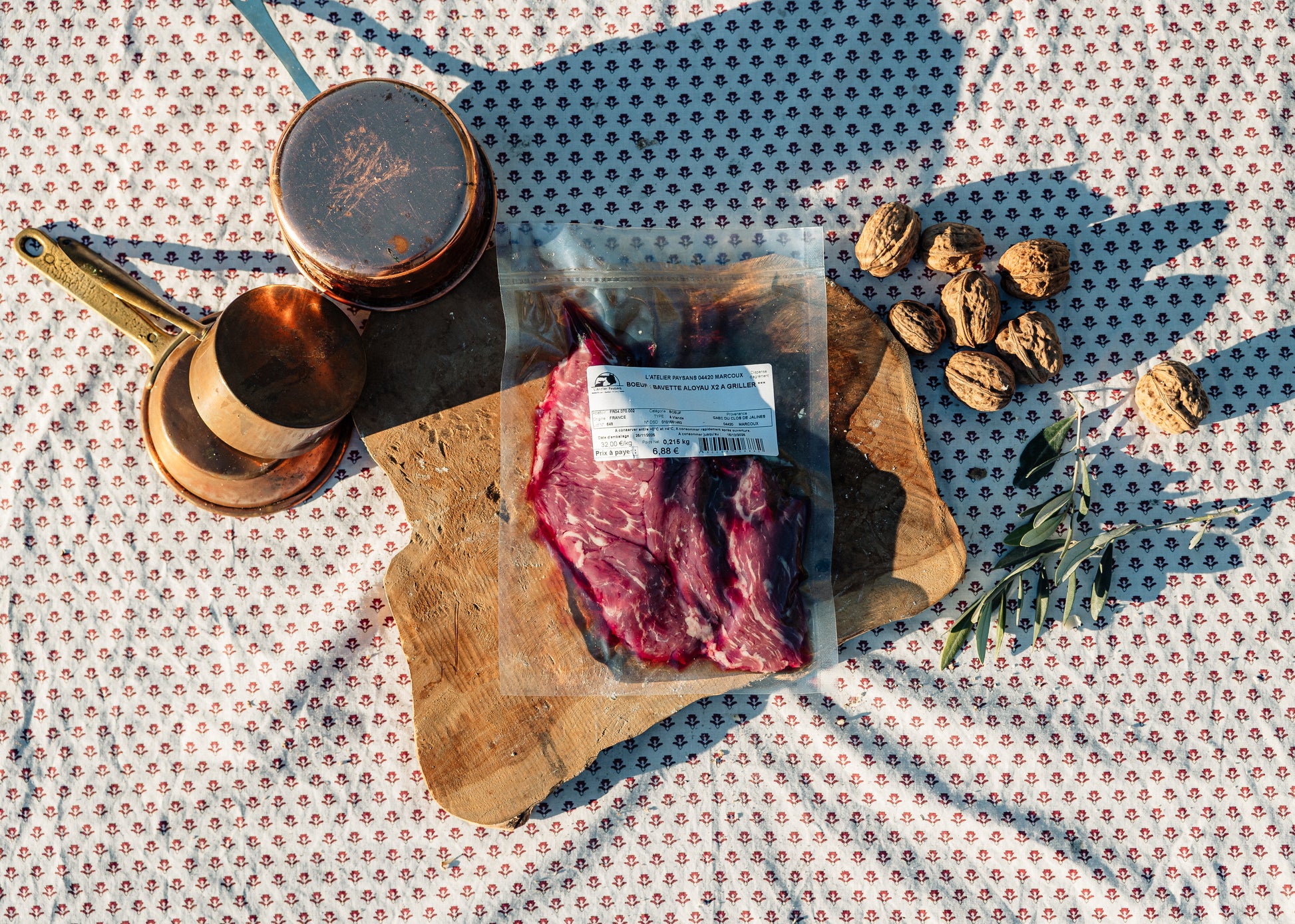 Deux bavettes de bœuf élevé à Marcoux et transformées artisanalement par l'Atelier Paysans sur l'exploitation.